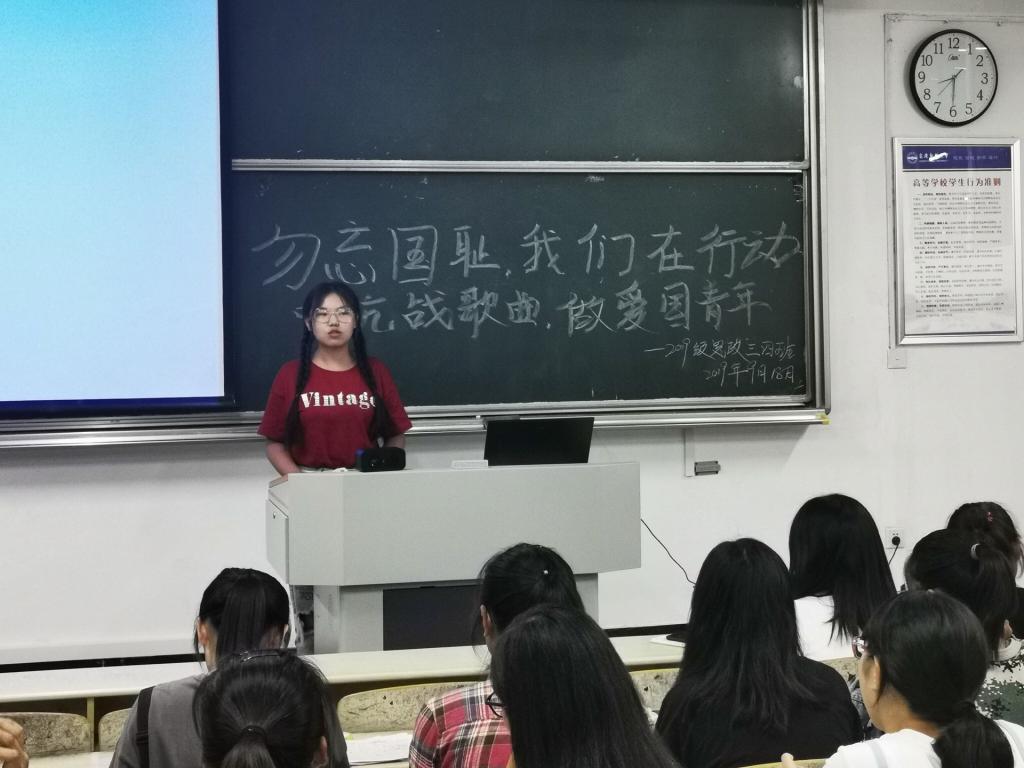 本次活动以纪念“九·一八事变88周年”为主题,分为“集体默哀、用心聆听抗战歌曲、全体观看抗战片、自由阐述感想”四个部分展开。