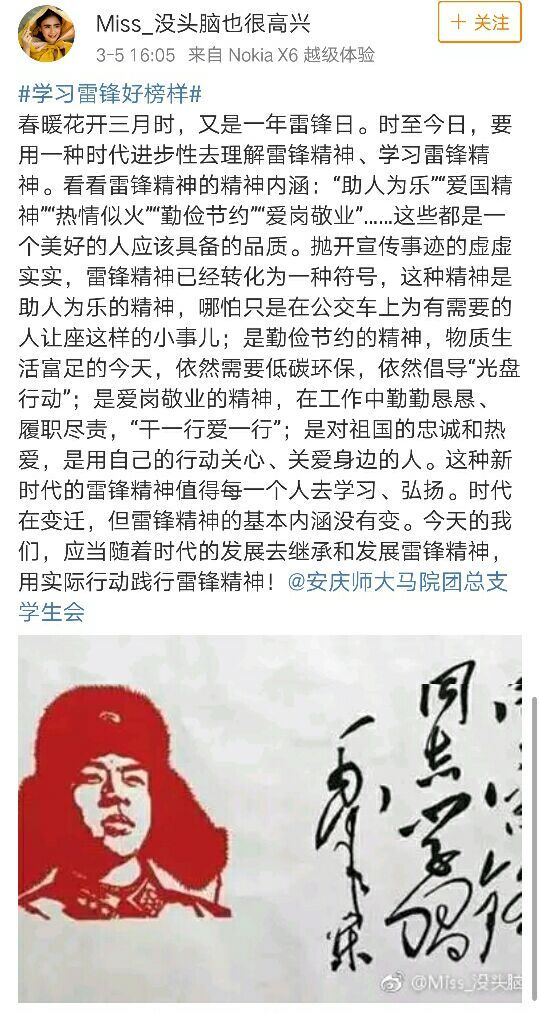 学院通过微信公众号--安庆师大马院团总支学生会,推送“向雷锋同志学习”、“学习雷锋好榜样”、“重温雷锋故事”三个特辑,分享雷锋同志及其他以实际行动践行雷锋精神的典型人物的先进事迹。有为报效国家与社会将毕生积蓄捐给华南农业大学的卢永根夫妇,有为救他人而壮烈牺牲、忠肝义胆的消防官兵杨科璋、有始终树立“四个意识”,坚决贯彻党中央决策部署、率领全县党员干部撸起袖子加油干的因公殉职的人民好公仆廖俊波……这些先进事迹深深地感动着同学们的心灵,激发了同学们学习雷锋精神的热情,提升了同学们的思想觉悟。