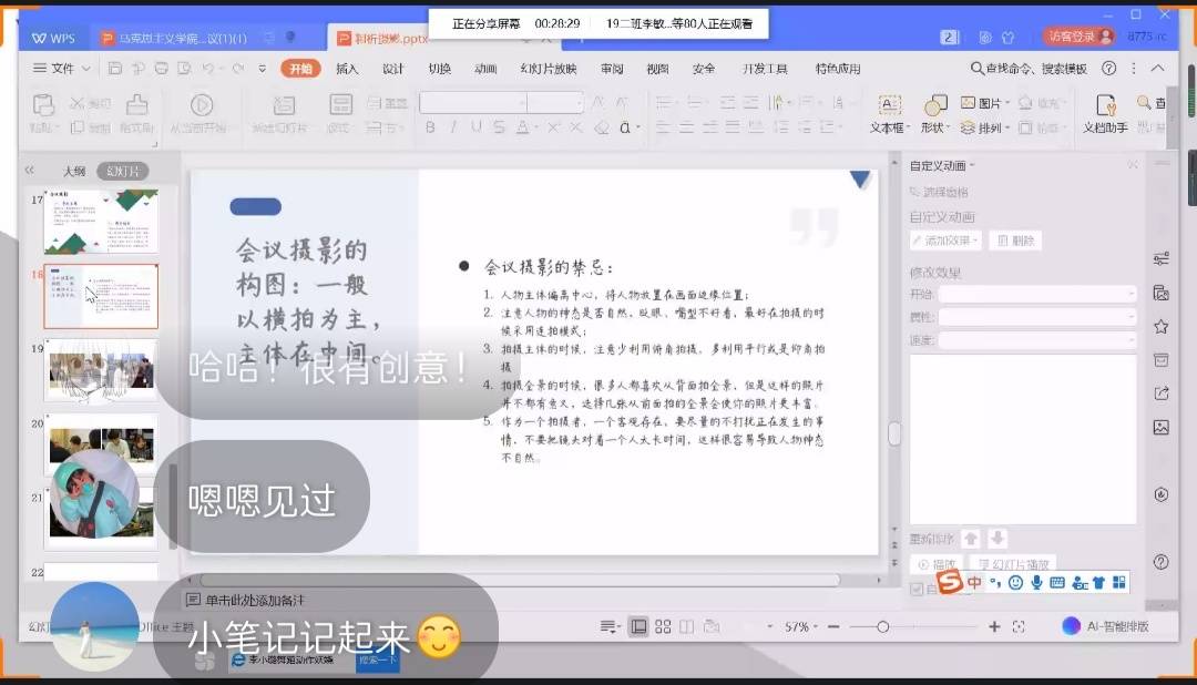 新闻稿的撰写和活动照片的展示,是一篇新闻报道不可或缺的组成部分。“一张好的照片,能带给人一种持久的震撼。”手机摄影、摄影的构图法则、纪实摄影的认识是传媒学院广播电视学专业2018级(2)班的李玉衡为我们带来的知识分享。“注重摄影的构图可以更好的带入主题,表达图片的主次,展示作者的情绪”,他介绍了常见的几种构图方式,如“三分法”“视觉引导线”以及“水平构图”。此外,他对于大家颇为关注的会议摄影方面提出了建议:注意图片主题的突出,人物神态的自然以及摄影角度的选择。