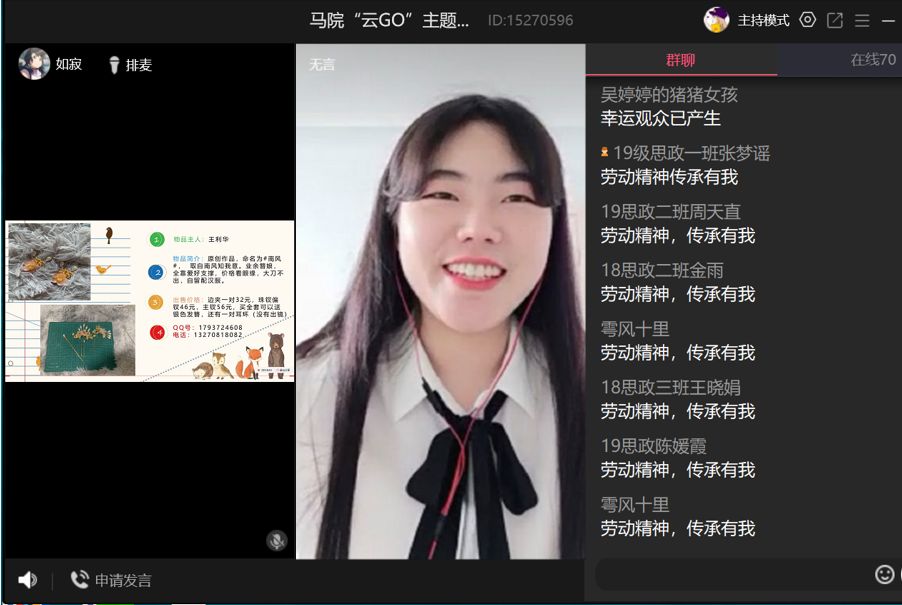 5月1日上午,6165金沙总站官方入口成功举办了“五一”线上专题分享会――“云Go”,此次活动面向学院内外征集相关手工作品,并以直播形式进行拍卖,老师和同学们积极参与其中,首期直播由思想政治教育2018级(1)班的杜芮主持。