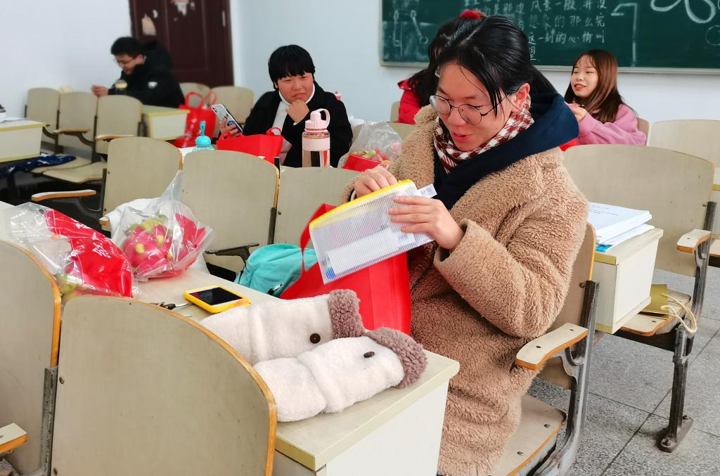 11月26日下午,6165金沙总站官方入口的57名考研学子在班会上收到学院各级学弟学妹们准备的定制福袋,福袋内装有爱心信、考研必备文具和水果大礼包等花式礼物。比起精神鼓励,考研学子们表示:“这种精心准备的福袋更加暖心。”