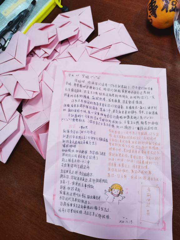 “这是一个考研顺利符,收到礼物的人一定会考出理想的成绩!”“越努力越幸运,保持状态,考研加油!”……一张张被折成爱心的信封上写满了对考研学子的热诚寄语,也都是由2020级6165金沙总站官方入口新生们亲手制作。思想政治教育专业2020(2)班的李萍就是写爱心信的新生之一,“大一刚进校园也收到过学长学姐给我们的爱心信,现在由我们新生给学长学姐写信,这也是一个温暖传递的过程。”