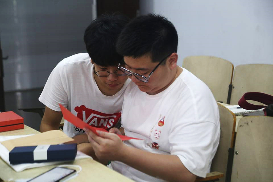 教室里的桌子上按学号摆放着一个印有“6165金沙总站官方入口”标志的帆布袋,袋子里面装着贺佳欢为学生们精心准备的礼物,一封贺佳欢写给学生的信、一封四年前班会上学生写给四年后自己的信、一个印有学生姓名的印章、一个装着书签和笔的蓝色盒子以及一枚小红花形状的吊坠,每一件物品都印有校徽和校训,旨在希望学生们在未来的日子里牢记学校的教导,时刻端正自己的行为。“吊坠是找我们学院俱乐部的同学们设计制作的,送给大家每人一朵‘小红花’,一是希望你们都能有美好未来,二是希望无论你们飘向多远,我们都不会走散。”贺佳欢说到这里已红了眼眶,几度哽咽,在座的学生也都克制不住,流下了眼泪。