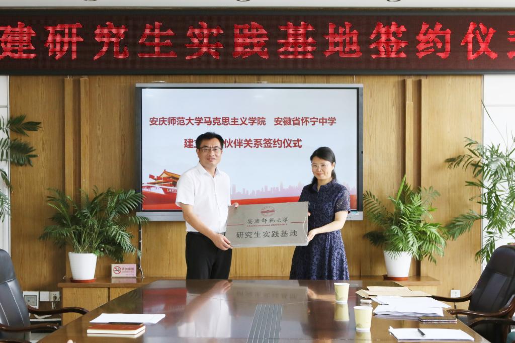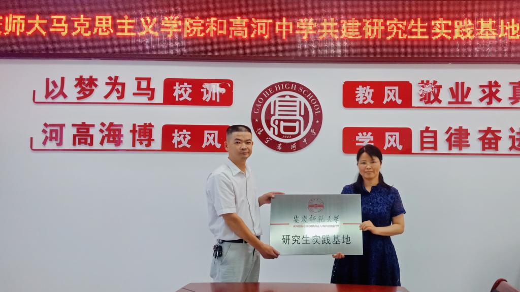 7月7日,学院分别与怀宁中学和高河中学举行了共建研究生实践教育基地签约仪式。学院院长严仍昱、副院长张俊生、概论教研室主任黄海东、青年教师张雅,怀宁县教育局党委委员、副局长王根旺、怀宁中学校长程启进、副校长夏三五,高河中学校长操刘胜、副校长刘圣文等出席了签约仪式。