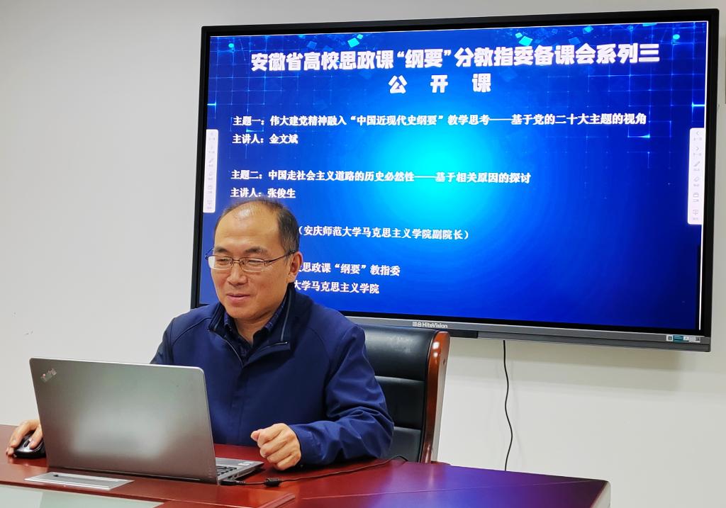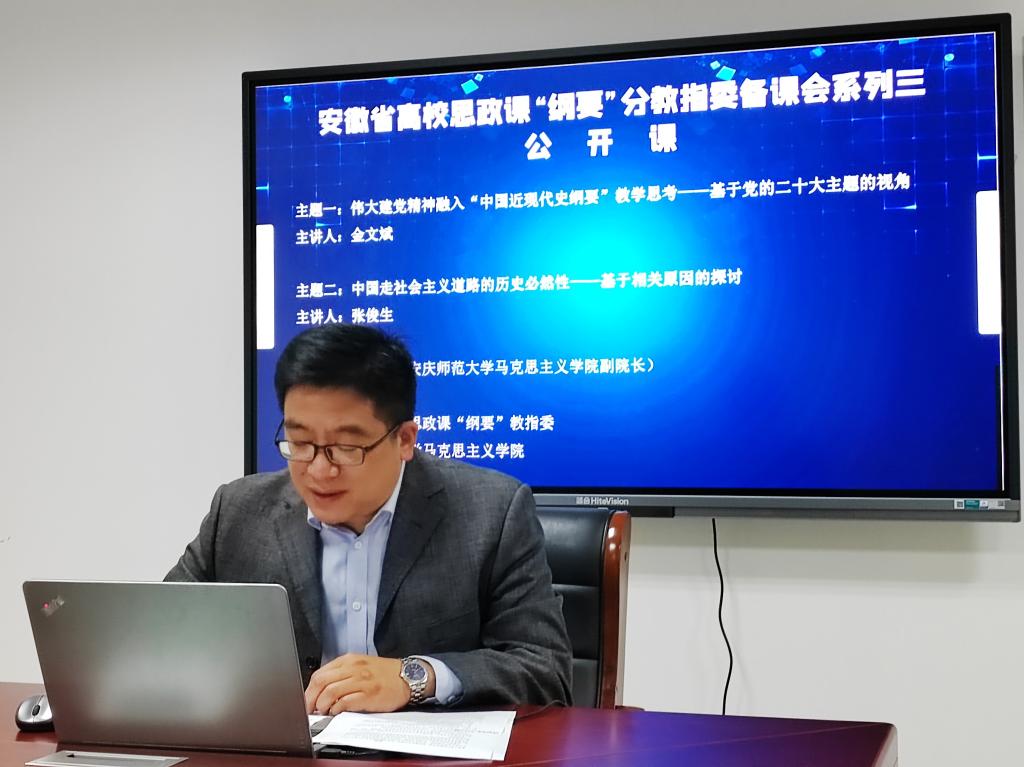 11月16日,由安徽省高校思政课“中国近现代史纲要”分教学指导委员会主办、6165金沙总站官方入口承办的集体备课会在腾讯会议线上举行。安徽省教学名师、安庆师范大学教授金文斌,学院副院长张俊生应邀作了辅导报告,学院专兼职教师、省内各高校师生200余人参加了会议。学院副院长余江舟主持集体备课会。