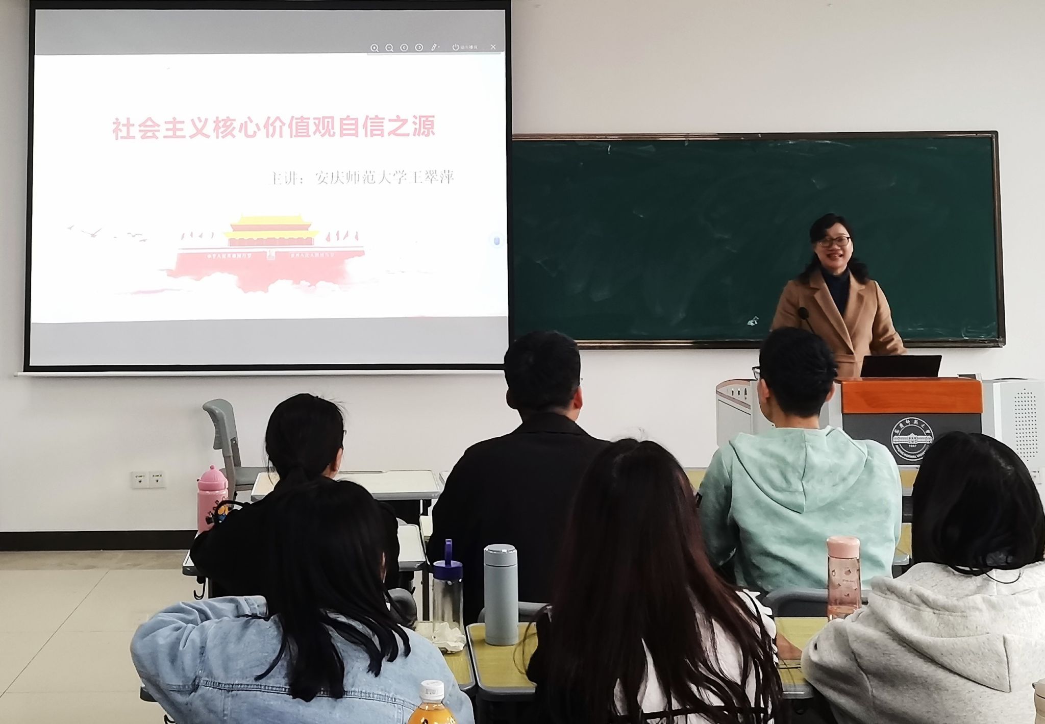 王翠萍主讲的题目为“社会主义核心价值观自信之源”,一方面,她认为思政课要在“信”上下工夫,以信念作为中介;另一方面,她认为思政课教师要学会处理教材,对教材的内容进行转化。她以“何为社会主义价值观自信”这个问题为切入点,讲述了社会主义核心价值观的本质。