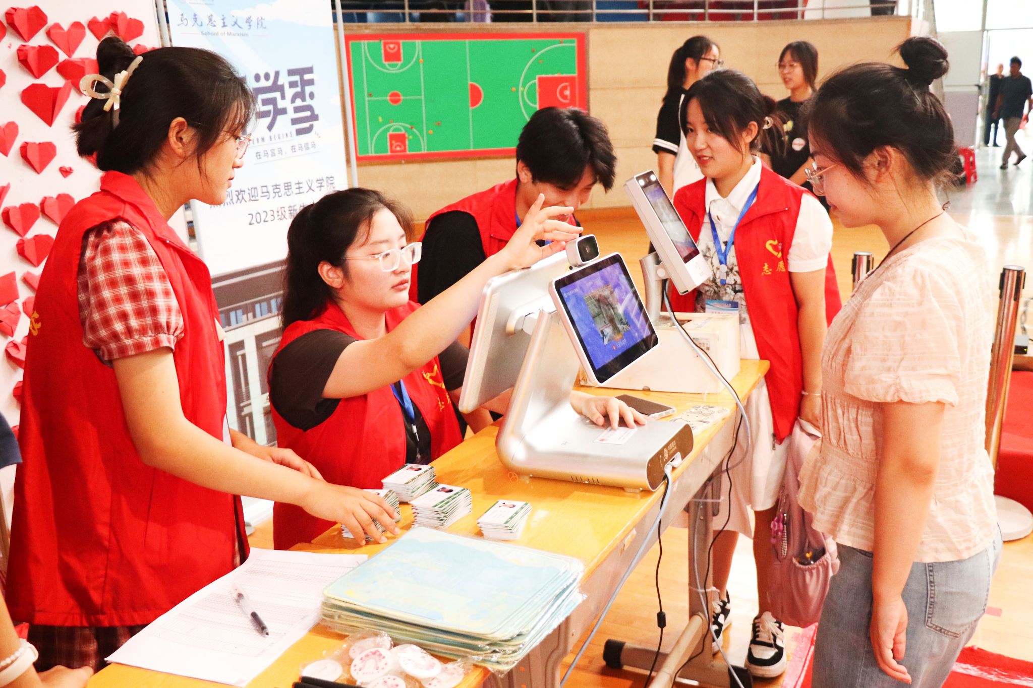 清晨七点半,学院第一位新生已抵达体育馆内报到处,马克思主义理论专业2023级(1)班的研究生褚雨帆本科就读于本校,学校里的一切都让她倍感熟悉与温暖。她表示学院的迎新活动乐趣十足,盲盒中印有敬敷广场的鼠标垫“颜值很高”,象征着学校文化特色的黄梅戏人物挂件“十分可爱”。